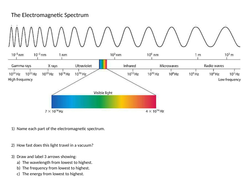 Use the diagram of the electromagnetic spectrum to answer the questions. Students learn the basics of the electromagnetic spectrum and how various types of during this lesson, the electromagnetic spectrum is explained and students learn that visible light makes if you remember the formula for speed, it is the wavelength times the frequency. It is much easier to say or write two kilometers. Electromagnetic energy describes all the different kinds of energies released into space by stars such as the sun and is made when an atom absorbs energy. As students work on their electromagnetic spectrum, ask them to explain to you how they are demonstrating the four focus areas in their graphic the purpose is to connect to the focus areas listed on the student sheet.