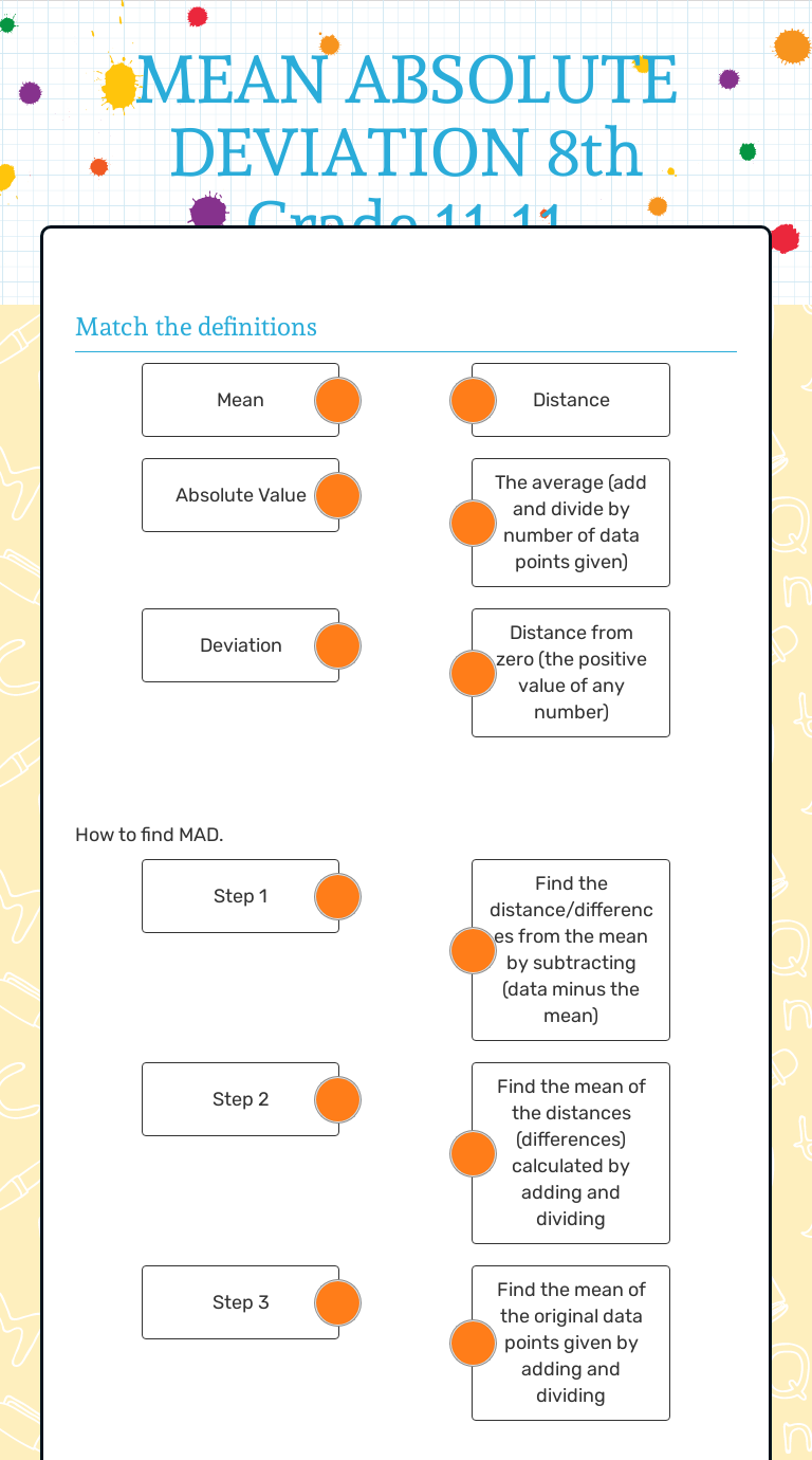 This worksheet can be downloaded in seconds along with the other valuable. This resource can used as partner work, a game, a small group activity, for fast finishers, or for a whole class activi. In this worksheet, we will practice finding and interpreting the mean absolute deviation. In statistics, the median absolute deviation (mad) is a robust measure of the variability of a univariate sample of quantitative data. This worksheet is easily accessible and can be incorporated use this worksheet for your own personal use completely free.